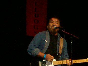 The lineup for El Chicano included founding members Fred Sanchez (bass) and Bobby Espinoza (organ), Rudy Regalado (timbales), who joined El Chicano on their third album, "Celebration," lead vocalist/guitarist Jerry Salas, a member since the fourth album, "El Chicano," on which he sang the lead vocal on their hit record "Tell Her She's Lovely," Ray Carreon (guitar), Sal Rodriguez (drums), who was a member of Tierra in the late 80s before becoming drummer for War, Marcos Reyes on congas, also currently a member of War, and Bertha Oropeza, Dolores DeAngelo, and me on background vocals.  Bertha is a great vocalist who sings with the popular East L.A. band, Chico.  El Chicano's set began with an uptempo instrumental, "Juntos," from their 1972 "Celebration" album, which gave all the players a chance to show their stuff and got the crowd going.  This was followed by El Chicano's break out instrumental hit, "Viva Tirado," which got a tremendous ovation after the audience recognized the first few notes.  After "Viva Tirado," Bertha, Dolores and I came out to our vocal mikes on the right side of the stage to sing background vocals on "Brown-Eyed Girl," on which Fred and Jerry shared the lead vocal.  Next Bertha was featured on lead vocal on El Chicano's classic version of "Sabor a Mi," which received a thundering response.  She sang it beautifully.  At this point, Fred Sanchez introduced the members of the band.  He introduced me by saying (I'm paraphrasing here), "Mark Guerrero's a singer/songwriter, writer, historian, man this guy does everything.  He's also the son of Lalo Guerrero and an alumni of Garfield High School."  Much cheering ensued, I'm sure helped along by the mention of Garfield High School, but I appreciated Fred's kind and thoughtful introduction.  The closing song of the set was El Chicano's 1974 hit "Tell Her She's Lovely," on which Jerry Salas sang lead with Bertha, Dolores, and I on harmony vocals.  Bobby Espinoza also sang harmony with us on both "Brown-Eyed Girl" and "Tell Her She's Lovely" so we had plenty of voices to fill out the harmony parts in a strong and effective way.  Watching Jerry Salas from the stage gave me a unique perspective to see that he's a dynamic performer as well as an excellent singer, making him a excellent front man for the band.  El Chicano sounded great from the beginning to the end of the set and we got a standing ovation after our performance.
